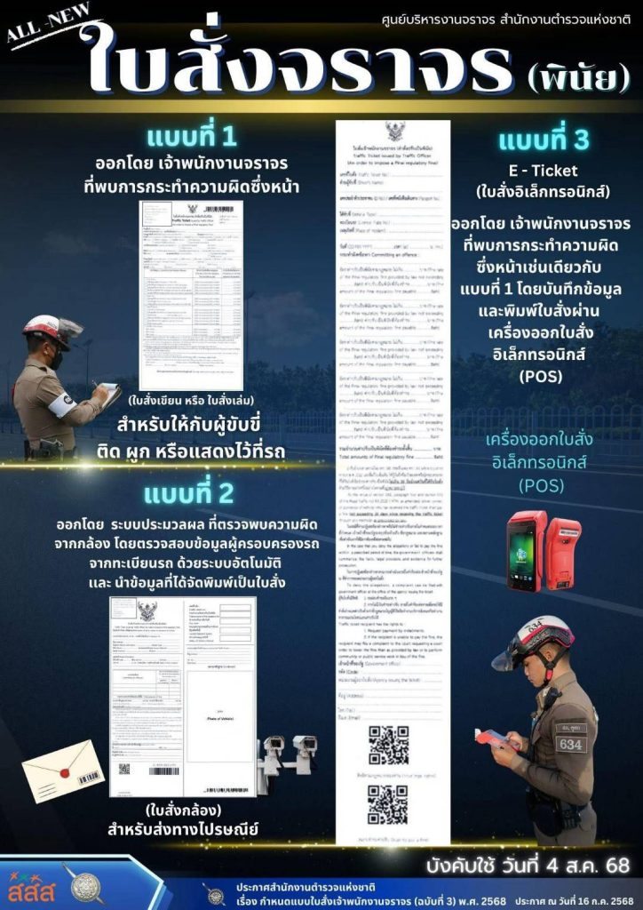 สำนักงานตำรวจแห่งชาติได้กำหนดให้ใช้ ใบสั่งจราจรรูปแบบใหม่ (พิมพ์) ตั้งแต่วันที่ 4 สิงหาคม 2568 เป็นต้นไป เพื่อให้การออกใบสั่งมีมาตรฐาน โปร่งใส และตรวจสอบได้ง่ายขึ้น โดยแบ่งออกเป็น 3 รูปแบบ ได้แก่