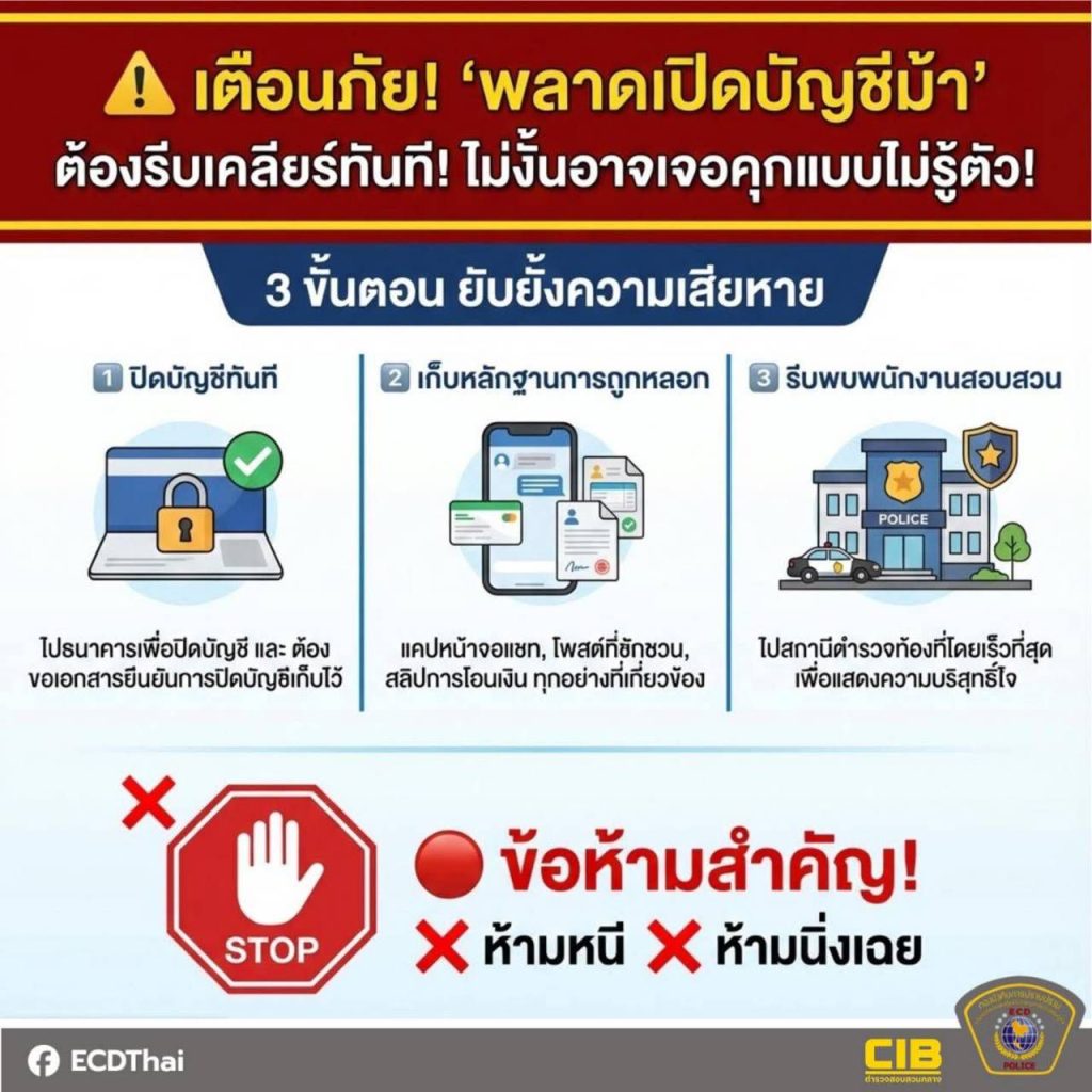ตำรวจเศรษฐกิจ (ECD) ขอแนะนำ 3 ขั้นตอน ยับยั้งความเสียหายจากบัญชีม้า ที่สามารถ“หยุดวงจรมิจฉาชีพ“ ได้ด้วยตัวคุณเอง
