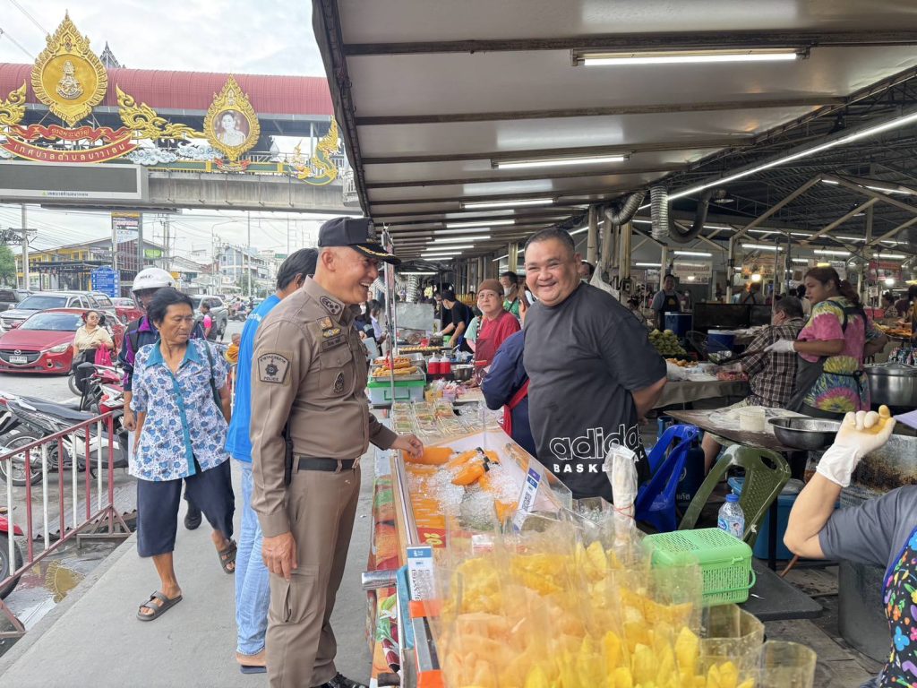 พ.ต.อ.สิรภพ อนุศิริ ผกก.สภ.บางใหญ่ ตรวจเยี่ยมพูดคุยแม่ค้าหน้าตลาดดอนพรม