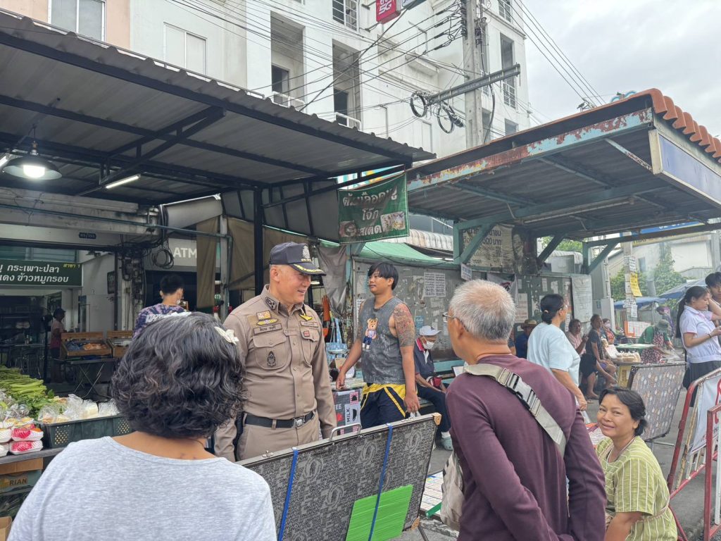 พ.ต.อ.สิรภพ อนุศิริ ผกก.สภ.บางใหญ่ ตรวจเยี่ยมพูดคุยแม่ค้าหน้าตลาดดอนพรม