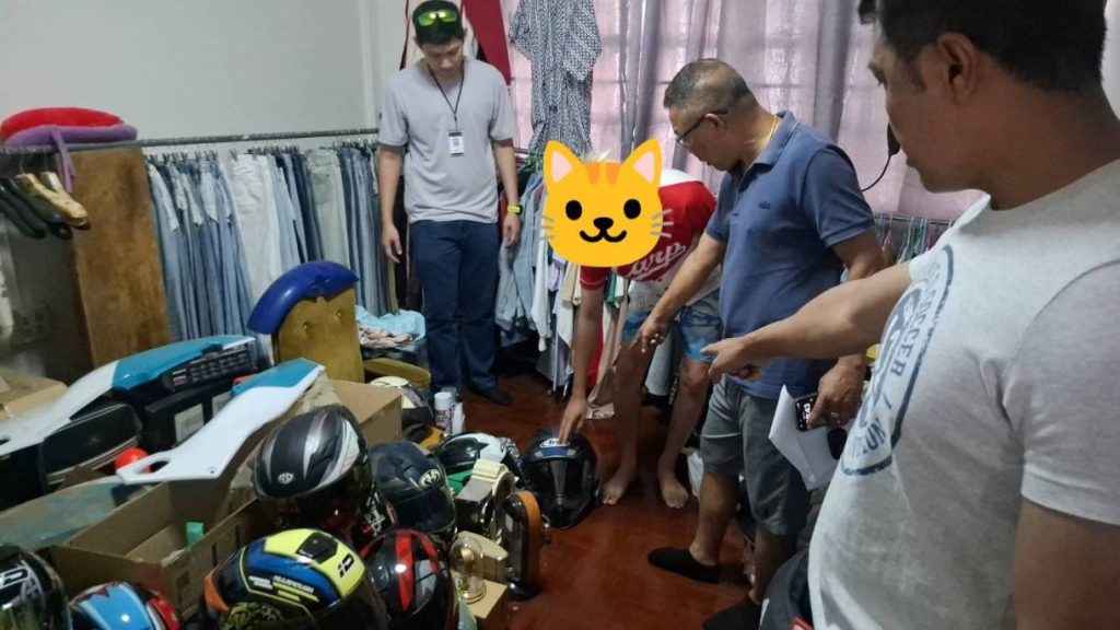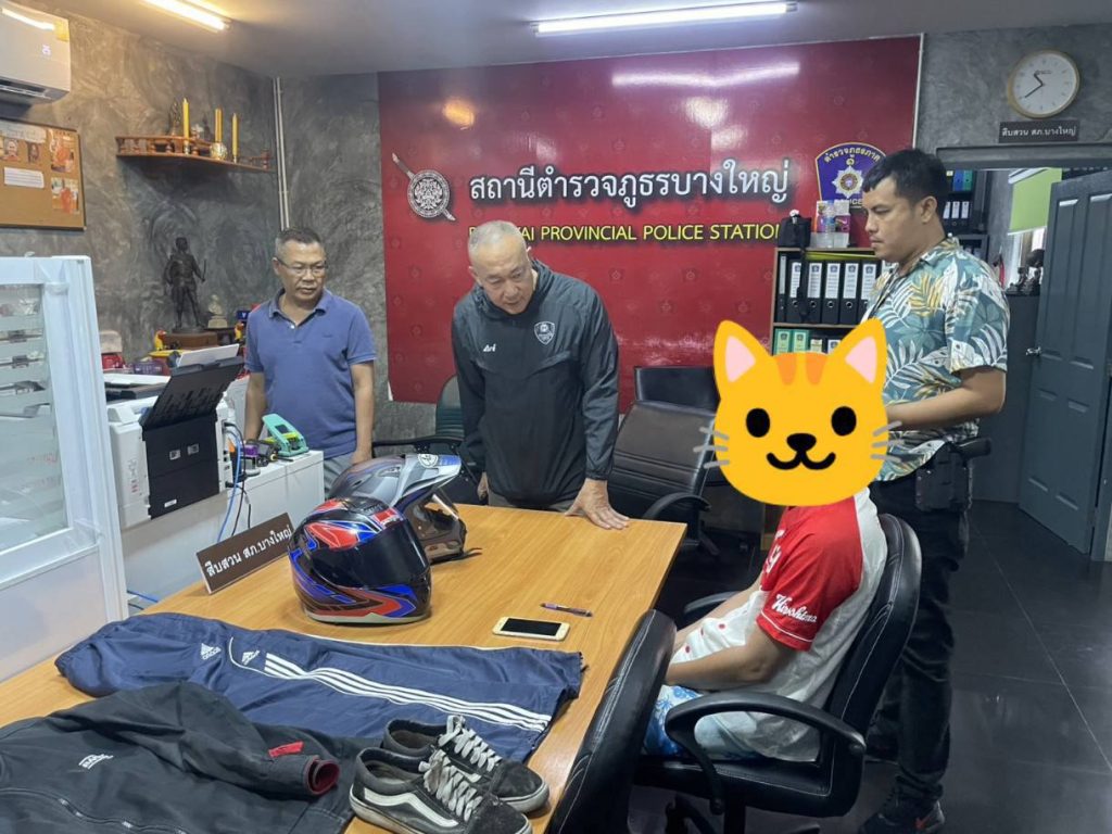 เจ้าหน้าที่ตำรวจได้เข้าตรวจค้นบ้านพักภายในหมู่บ้านแห่งหนึ่งในพื้นที่ อ.บางบัวทอง จ.นนทบุรี พบของกลางหลายรายการ รวมถึง หมวกกันน็อกยี่ห้อ Arai สีเทา-ดำ-แดง มูลค่าประมาณ 40,000 บาท ซึ่งเป็นทรัพย์สินของผู้เสียหายที่ถูกลักไปจากปั๊มน้ำมัน ปตท.เวสต์วิลเลจ บางใหญ่