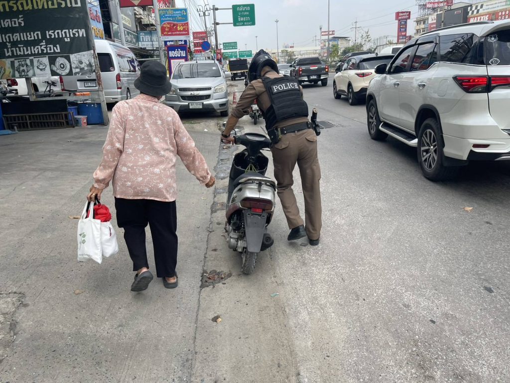 วันนี้ เจ้าหน้าที่ตำรวจสายตรวจเขต 123 ว.4 ในพื้นที่รับผิดชอบ พบคุณยายเข็นรถจักรยานยนต์ บริเวณถนนกาญจนา เจ้าหน้าที่ตำรวจจึงได้เข้าสอบถาม คุณยายแจ้งว่ารถสตาร์ทไม่ติด จึงได้ให้ความช่วยเหลือ ทำให้รถจักรยานยนต์ขับเคลื่อนได้