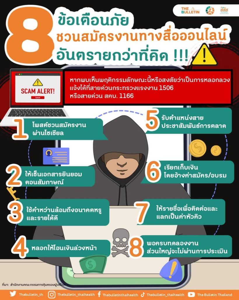 ☎️ หากพบพฤติกรรมเข้าข่ายหลอกลวง แจ้งสายด่วนกระทรวงแรงงาน 1506 หรือสายด่วน สคบ. 1166